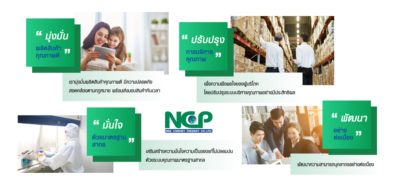 นิวคอนเซพท์ โปรดัคท์ จำกัด เป็นบริษัทแรกและบริษัทเดียวในกลุ่มผู้ผลิตสินค้าสมุนไพรที่มีการควบคุมคุณภาพในทุกกระบวนการผลิตตั้งแต่การจัดซื้อวัตถุดิบ ตลอดจนส่งสินค้าไปถึงมือผู้บริโภค และยังมีมาตรฐานต่าง ๆ เทียบเท่าระดับโลกเพื่อคุ้มครองผู้บริโภคสร้างความมั่นใจในความปลอดภัยของอาหาร และยังคงไม่หยุดนิ่งในการพัฒนาในด้านต่าง ๆ เพื่อรักษามาตรฐานดี ๆ ที่มีไว้ให้คงอยู่ตลอดไป